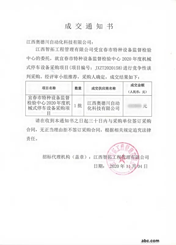秋天是丰收的季节,我们迎来了中标捷报,我公司成功中标“宜春市特种设备监督检验中心2020年度机械式停车设备采购项目”。